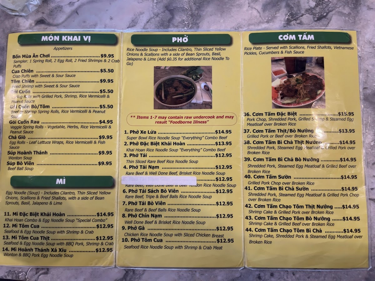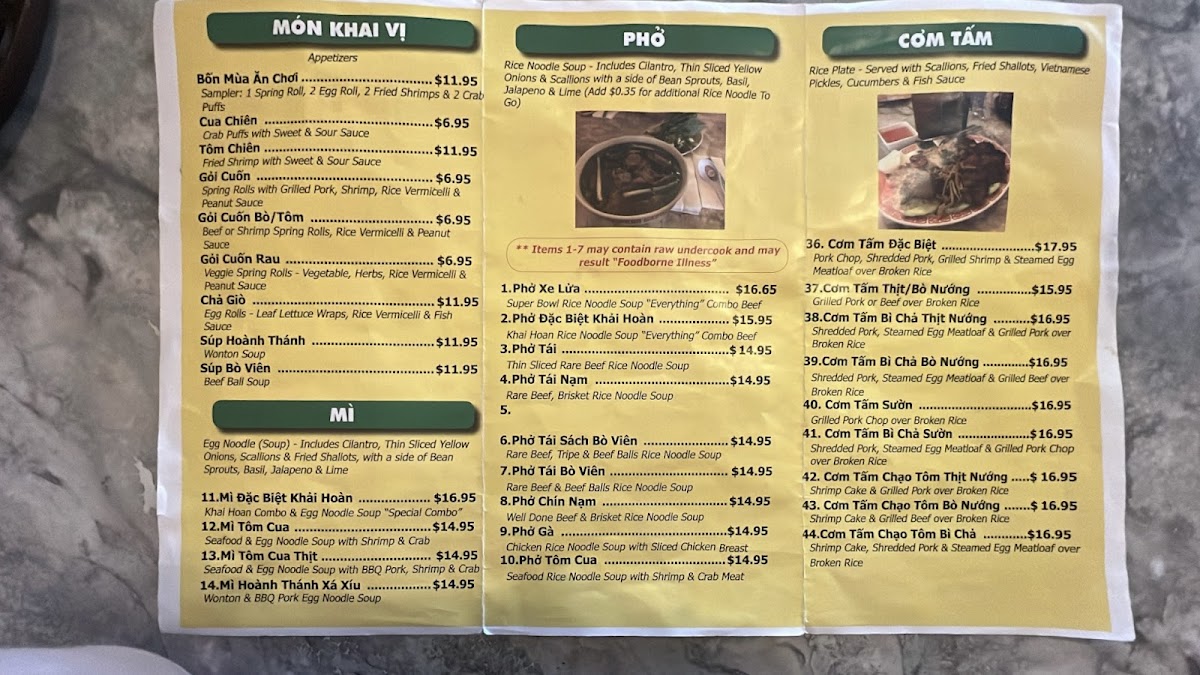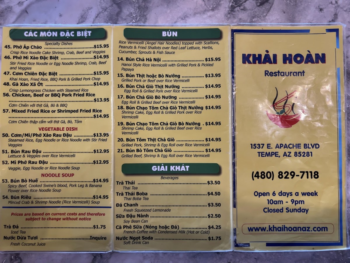 If you're in the mood for authentic Vietnamese flavors, the Khải Hoàn Restaurant Menu offers a delightful mix of traditional dishes with a modern twist. Nestled in Tempe, AZ, this cozy spot is the perfect place to experience the richness of Vietnamese cuisine. From the savory pho with tender cuts of beef to the crispy spring rolls filled with fresh ingredients, every dish is crafted with care. The menu also features a range of stir-fries, rice bowls, and aromatic soups that are sure to satisfy any craving. Whether you're a longtime fan of Vietnamese food or a newcomer looking to explore, there's something here for everyone. The combination of bold spices, fresh herbs, and vibrant flavors makes each meal at Khải Hoàn a memorable experience.